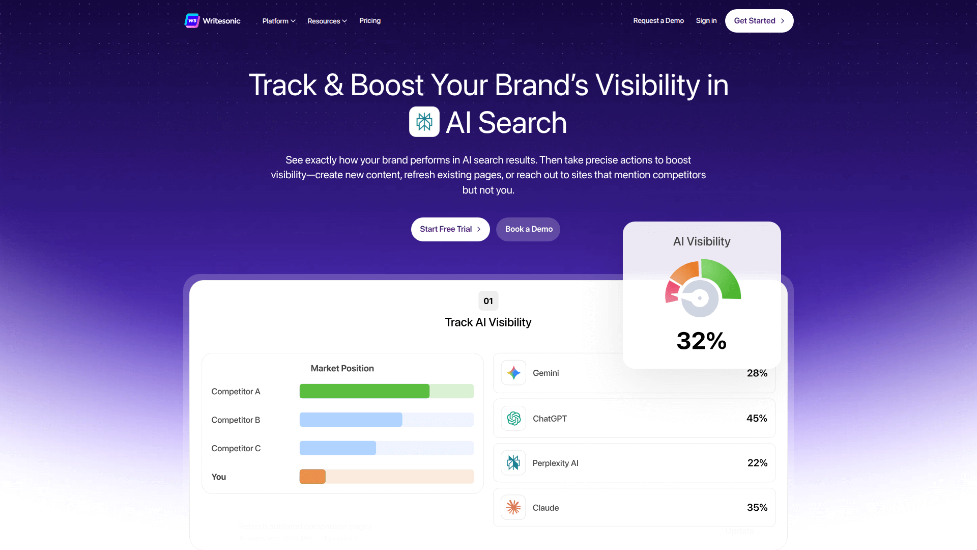 Writesonic is an advanced AI search visibility tracking and optimization platform designed for the modern digital landscape. As search evolves from traditional blue links to AI-driven answers, Writesonic enables brands to monitor their performance across major platforms including ChatGPT, Gemini, Perplexity, and over 10 other AI engines. The platform provides a unique Generative Engine Optimization (GEO) toolkit that goes beyond simple keyword tracking by analyzing sentiment, visibility scores, and real-time citations. What sets Writesonic apart is its seamless transition from insights to action. Users can identify citation gaps where competitors are mentioned and gain precise AI-driven recommendations to secure their own brand's spot in AI responses. The tool also features a robust SEO and Content Engine that integrates live data from Ahrefs and Keyword Planner. This allows teams to create fact-checked, internally linked content that satisfies both Google's traditional algorithms and the complex ranking requirements of large language models. Whether you need to fix technical SEO issues instantly or refresh existing content for better AI citation, Writesonic provides an end-to-end GEO workspace.